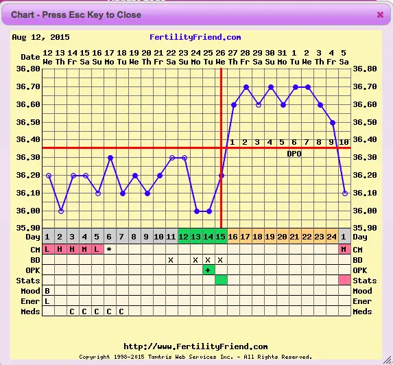 dikey kırmızı çizgi ovulasyon öncesi ve sonrasını ayırmak için çizilmiş. ben 15. gün ovüle oldum bu ay, ovulasyon testiyle kanıtladım bunu. grafikte ateşim de bunu doğruluyor.