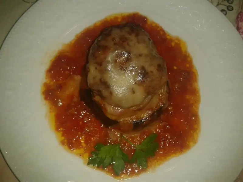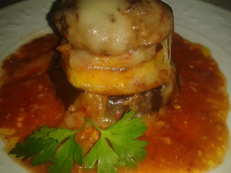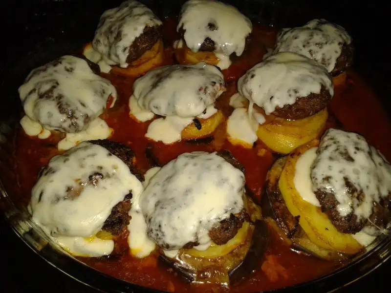 Patlıcanlar alacalı soyulup yuvarlak dilimlenip tuzlu suda bekletilir.Sonra kurulanıp hafif tuzlanıp kızartılır.Köfte malzemeleri karıştırılıp yuvarlak köfteler yapılır.Köfteler de kızartılır.Domates sos pişirilir.(Sosa bir su bardağına yakın su katabilirsiniz.)Fırın tepsisine patlıcan,patates,köfte şeklinde dizilip domates sos eklenir.200 derecede 15-20 dakika pişirilir.Almaya yakın kare kestiğini kaşar peyniri ekleyip tekrar fırına verilir.Kaşarlar eriyince afiyetle yenir:)