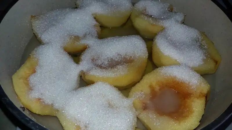 Aynalar yıkanıp ortadan ikiye kesilip orta kısımları çıkarılır ve kabukları soyulur.Kabuklarının yarısından fazlası ve çekirdekleri ayrılır.Tencereye ayvalar koyulup çekirdekleri ve kabukları eklenir.Su ilave edilip 5 dakika kaynatılır.Sonra şeker ilave edilip en kısık ateşte bir buçuk saat kadar ayvalar yumuşayıncaya kadar pişirilir.Soğuyunca kaymak ve cevizle servis edilir.Afiyet olsun.