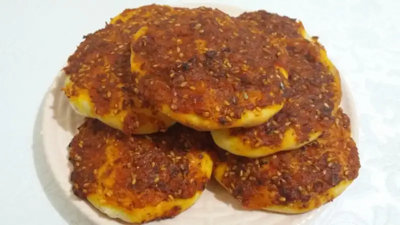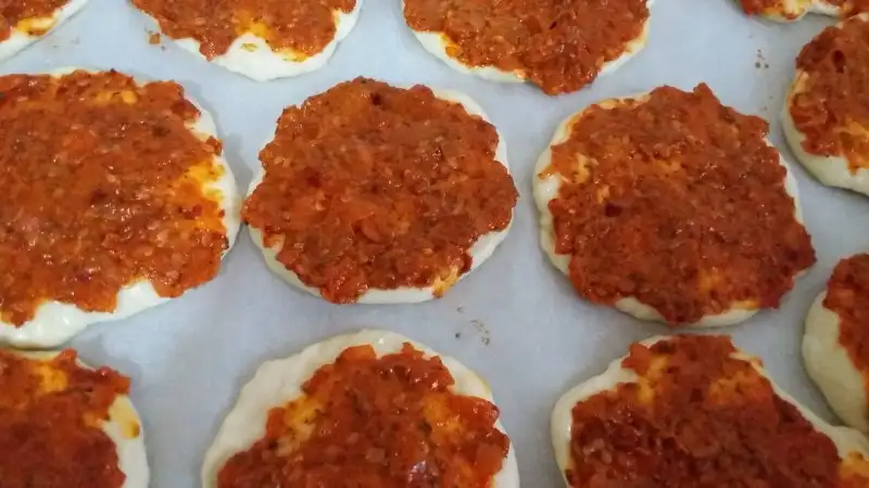 Süt,su ve maya karıştırılır.Diğer malzemeler eklenir.Aldığı kadar un eklenip yumuşak bir hamur elde edilir.Sıcak bir yerde üstü örtülüp 1 saat mayalandırılır.Yarım çay bardağı sıvıyağda yemeklik doğranmış soğan çok az pişirilir.Kabukları soyulup doğranmış domates eklenir.Az piştikten sonra biber salçası ve domates salçası eklenip çok az çevrilir.Sonra altını kapatılıp rondodan geçirilir.Nane,kekik,pulbiber,kimyon,susam ve tuz eklenir.Yağlı kağıt serilmiş tepside sıvıyağ yardımıyla yuvarlak hamurlar açılır.Salçalı karışım üzerine sürülüp pişirilir.(Bazılarının karışımına peynir ekleyip pişirdim.İsteğe bağlı)