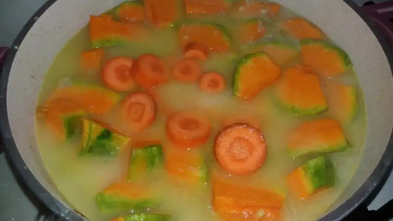 Tencereye tereyağını ve sıvıyağını koyup yemeklik doğranmış soğanı ekleyip kavuruyoruz.Biraz kavrulduktan sonra sarımsağı ekliyoruz.Soğanlar ölünce unu ekleyip bir dakika kadar çeviriyoruz.Kremayı ekliyoruz.Sonra sıcak suyu ilave edip dilim dilim doğranmış balkabağını ve havuçu ekliyoruz.Tuzunu ekliyoruz.Balkabakları ve havuçlar yumuşayıp pişince çorbayı rondodan geçiriyoruz.Karabiber ve pulbiberini ekliyoruz.Beş dakika kaynadıktan sonra altını kapatıyoruz.Limon veya kremayla servis ediyoruz.