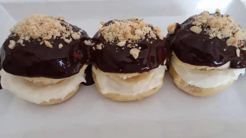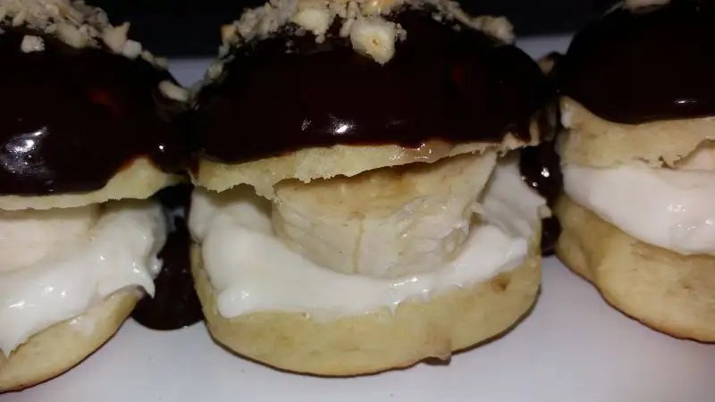 Derin bir kaba unu,mayayı ve vanilyayı koyup iyice karıştırıyoruz.Ortasını açıp şekeri,suyu,sütü,sıvıyağı ve yumurtaları ekleyip iyice yoğuruyoruz.Elimize yapışmayan bir hamur elde ediyoruz.(Hamur çok sert olmayacak)Üzerini kapatıp sarıp bir saat sıcak bir yerde mayalandırıyoruz.Hamur mayalanırken krema için tencereye sütü,şekeri,unu,nişastayı ve vanilyayı koyup pişiriyoruz.Kaynamaya başladıktan bir iki dakika sonra altını kapatıp soğutuyoruz.Soğuyunca içine bir paket toz krem şantiyi ekleyip mikserle iki üç dakika çırpıyoruz.Çikolata sosunu üzerindeki tarife göre göre hazırlayıp pişince içine bitter çikolatayı atıp eritiyoruz.Mayalanan hamurumuzdan yumurta büyüklüğünde bezeler alıp yuvarlayıp yağlı kağıt serilmiş tepsiye diziyoruz.(Kabaracağı için çok sık dizmeyin birbirine yapışır.)15 dakika tepside tekrar mayalandırıyoruz.Sonra 180 derece fırında pişiriyoruz .Üzeri hafif pembeleşince alıyoruz.(Çok pişirirseniz hamur sertleşir.Çabuk pişiyor fırından gözünüzü ayırmayın:)Soğuyan bezeleri ortadan bıçakla kesip tatlı kaşığıyla bol krema ve onun üzerine muz dilimi koyup kapatıyoruz.Üzerine çikolata sosu,onun üzerine de fındık serpip servis ediyoruz.Afiyet olsun:)