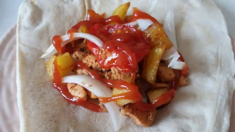 Tantuni mi yazmışım tavuk dürüm olacaktı.Eline sağlık. Domates mi o pişmiş gibi duruyor tantunin salatası çiğ olur pismez eğer pismisse. Domates.maydanoz ve soğan çiğ olur. sadece tavuk piser.