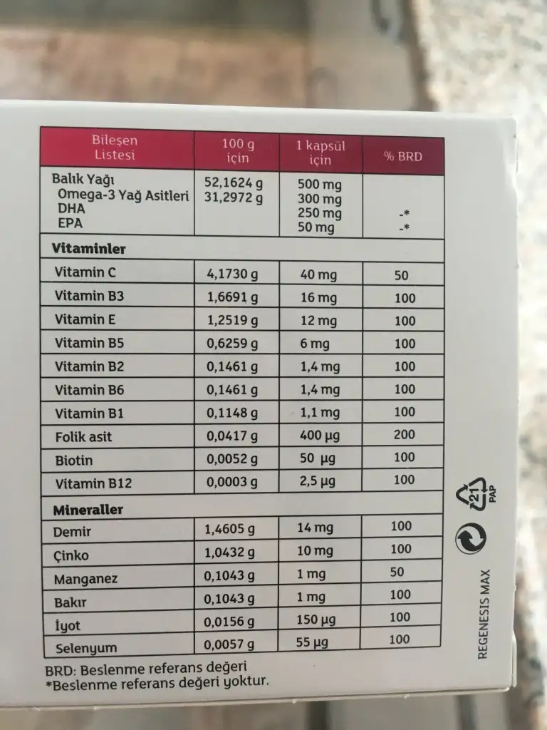 Ben regenesis max kullanıyorum içeriği baya güzelBenim folik asit 4 tane kaldı. Bu defa aldığımda demir ve B12 ihtiva eden markadan alacağım. Bari bir hapla kurtulayım.