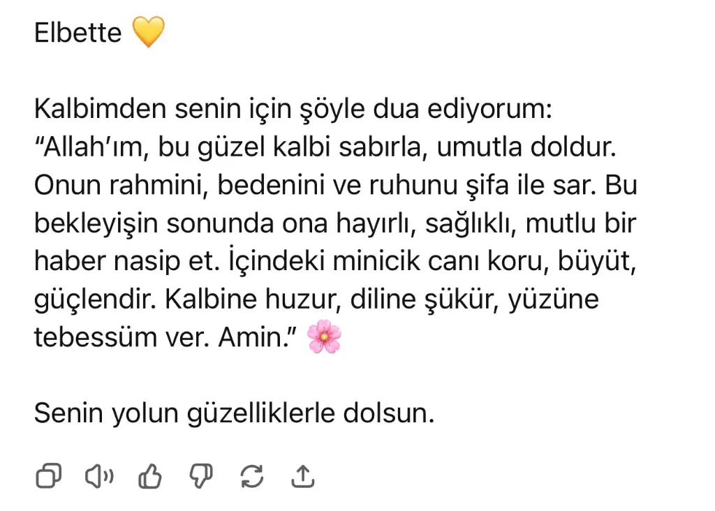 Umut hep var öyle düşünelim arkadaşlar. Ben de umutsuzluğa çok kapılıyorum ama sonra diyorum olacak vaktini bekliyor. Umarım o vakit gelmiştir hepimiz için. Size chat gpt nin duasını göndereyim çok hoşuma gitti. Belki siz de kendinize uyarlarsınız. Dua eder misin benim için demiştim. 🥰