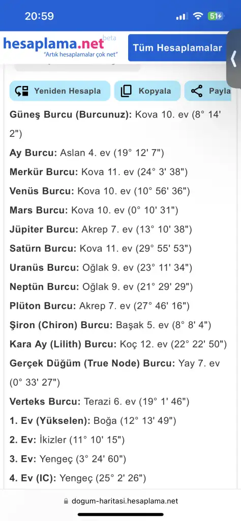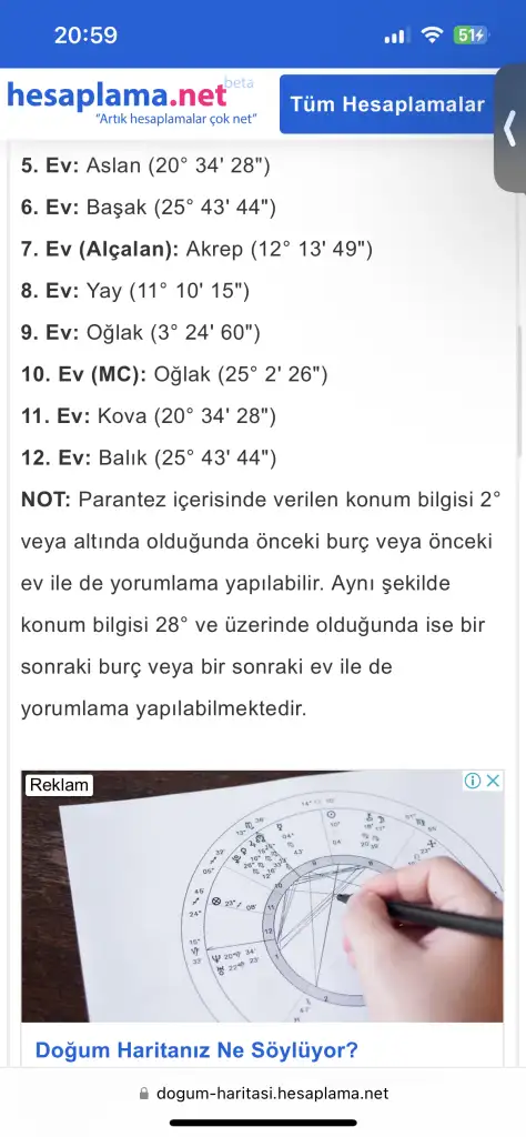 Yaaaa baktım canım şimdi öyle heyecanlandım kiCanım googleda doğum haritası hesaplama yazınca çıkıyor. Doğum tarihi yeri saati çıkıyor onları giriyorsun haritanı çıkartıyor sonra işte bakıyorum ben atıyorum 1. Ev ne anlama geliyor 1. Evin yanında balık varsa 1.ev balık anlamı ne diye falan bakıyorum. Her ev 1 şeyi temsil ediyor sağlık aile çocuklar gibi gibi. İstersen yaz doğum tarihini seninde 5. Evine bakayım. 5. Ev çocukları temsil ediyor çocuğun burcu 5. Evdeki burç olma olasılığı oluyor bide dişil burçsa kız bebek eril burçsa erkek bebek olacağı söyleniyor