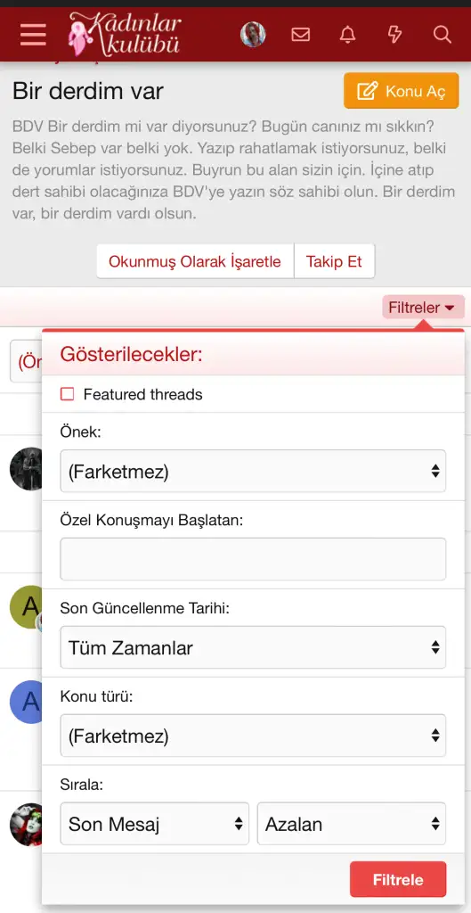 Bdv-filtreler-özel konuşmayı başlatan kısmına nicki yazınca tüm bdv konuları çıkıyor. Bana daMilletin forumda önceden ne yazdığını hangi konuları açtığını nerden görüyorsunuzBen ayakta uyuyorum sanırım.