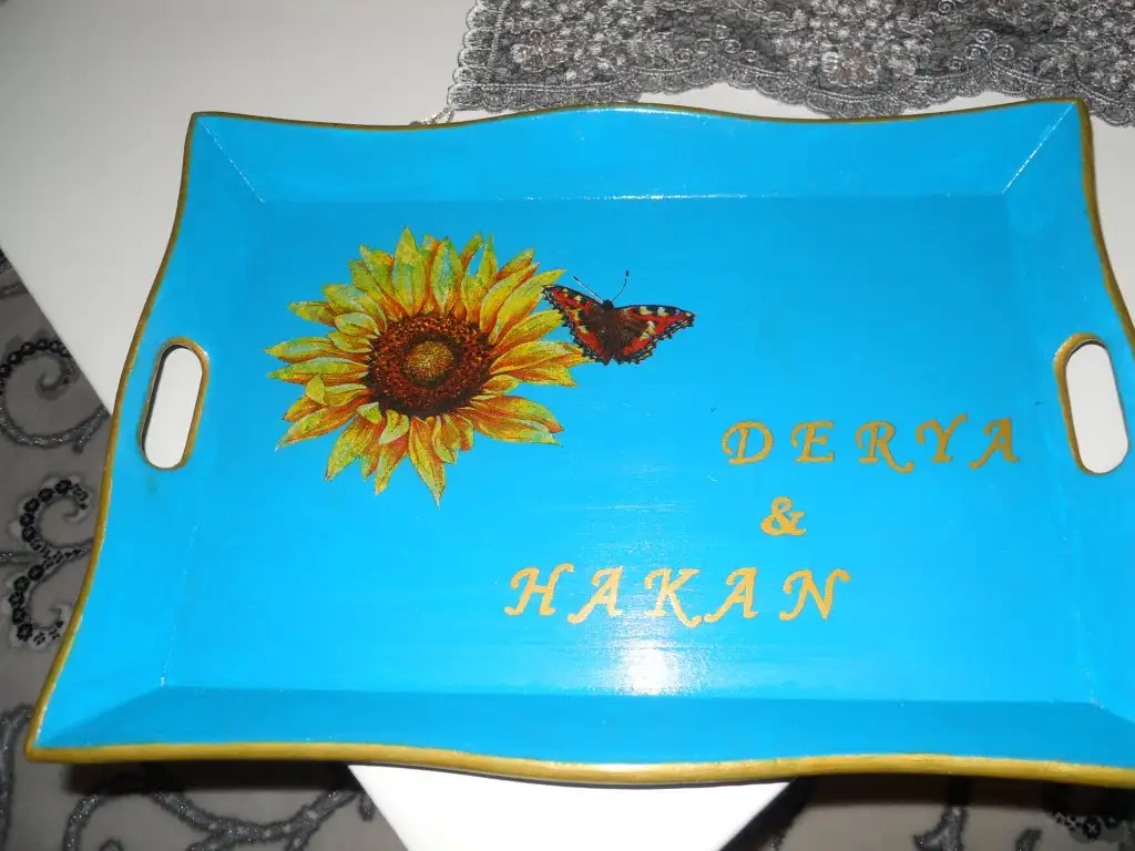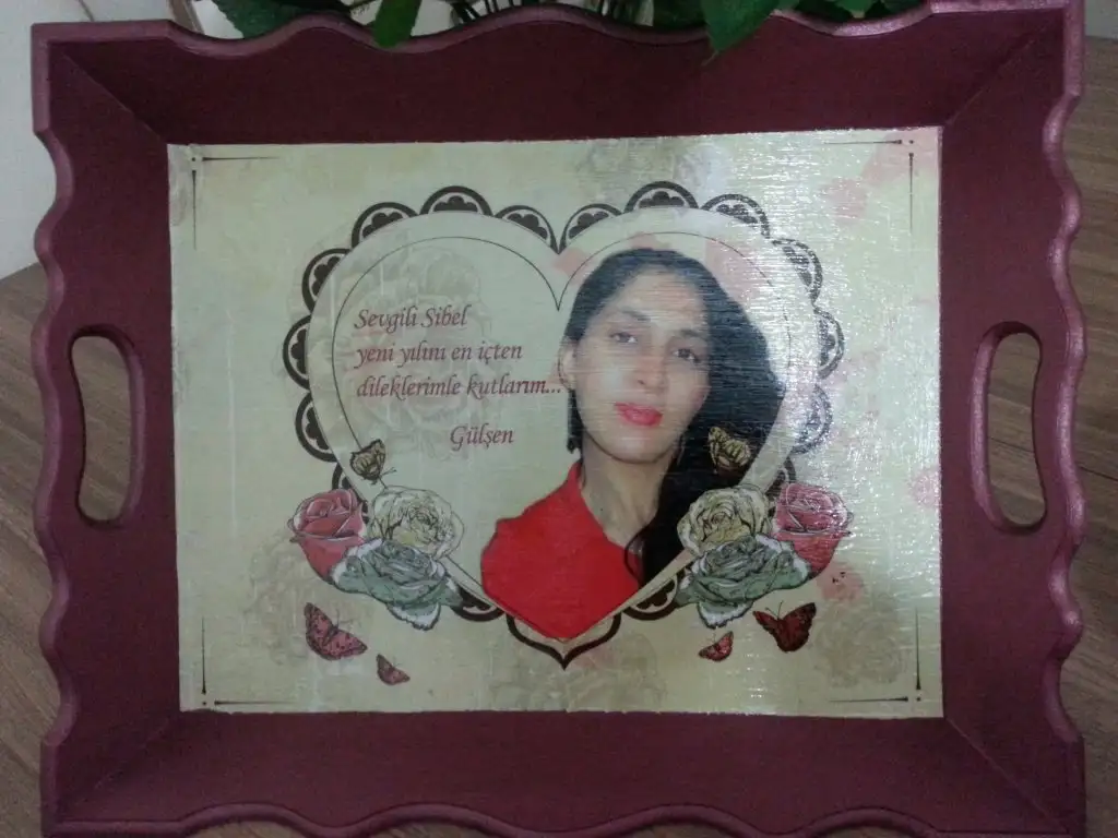 Çiziyormuşsunuz gibi geldi... Bayağı hoş duruyor. Mesela peçete yerine sticker yani etiket kullansak olmaz mı? Yani arkası yapışkanlı bir desen kullansak olmaz mı? Yapıştırsak ve üzerine tutkal geçsek ve sonra vernik geçsek. Ben de kişiye özel tasarımlar yapmaya başladım. Size face mi mesaj atarım. İşlerime bakarsınız. Ben aslında şunu yapmak istiyorum. Ahşap tepsinin içine kişinin fotoğrafını koymak veya kişinin adını yazmak istiyorum. Bunu gidip matbaaya bastırabilirim mesela. Fakat arkası yapışkanlı bastırırsam olur mu? Üzerine tutkal mı geçmeliyim yoksa direk vernik geçsem olur mu?