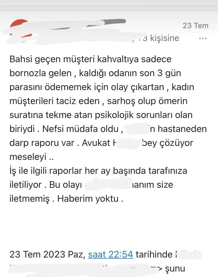 Bornozla kahvaltıya geldi diyor, kadınları taciz etti. Bunlara tepki vermemişler. Son gün otelden ayrılacağı zaman parasını ödemediğinde personel dövmüş.