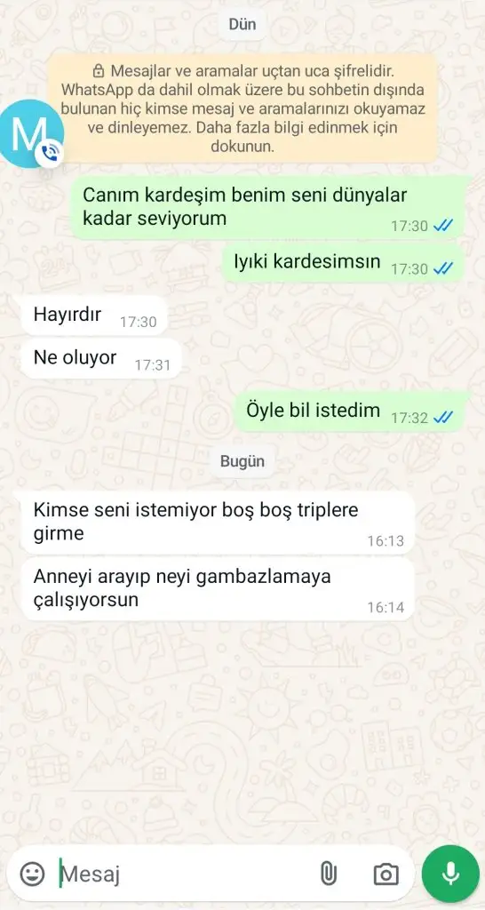 Merhabalar öncelikle iyi para kazanan bir işteyım kendi işim evliyim ama her zaman ailemin maddı manevı arkasında durmaya devam ettim kardeşime evlenırken yüklü bir para bile bıraktım hayatını kolayca kurşun dıye ama bana karşı kıskançlıkmı yoksa çevreden benı övüp onu yeren cümleler denmi bilmiyorum benden nefret edıyor geçen gün ona içimden geldi mesaj attım sonra annem babam aradı evde kıyamet koptu onla konuşma dediler annemlere gitmiyorum uzak durmaya çalışıyorum onlardan ama üzülüyorum da