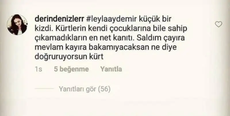 Söylesenize buna ve bu yorumu beğenen 5 kişiye ne denir? Ben bu şahsı bimere şikayet ettim, küçük bir kız çocuğu üzerinden halkı kin ne nefrete sürüklüyor. Pis aşağılık, rica ederim sizler de edin. Kimse bu elem dolu olaya böyle bir yorum yapamaz!