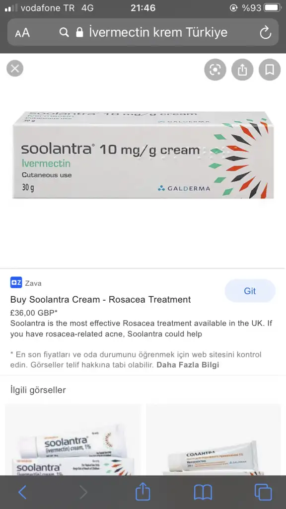 hmm anladım cnm...karışım kremi başka birisi kullanmış ben degil :) ben de letgo da soolantra kremin satıldıgını gördüm de...ivermectin içeriyor..aynen o krem https://www.letgo.com/tr-tr/i/soolantra-30-gr_51a65669-f6b5-4246-baa6-eff2c27c5939 ama ne kadar güvenilir bilmemBenım getırcem onun hapı kremı oldugunu senden duydum ılk defa fotosunu atarsan eger baktırcam ben burdan sordurcam eczacı tanıdık cok