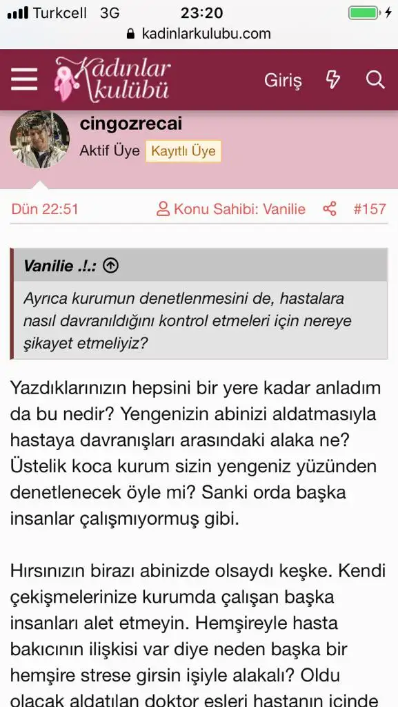 Hanımlar merhaba. Dün gece bir konu açtım ve yorumlarınız çok faydalıydı kibar ya da katı. Özel bir bakımevinde çalışan evli hemşire ve hasta bakıcının arasındaki ilişkinin, etik olmadığı ve yuva dağıttığı gerekçesiyle bu kurum şikayet edilebilir mi, işten çıkarılmaları sağlanabilir mi? Ki...