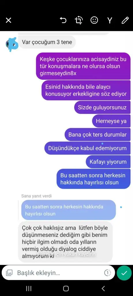 Kadının kocasına göndersem kötü olur diye düşündüm kadının 3 çocuğu var ve Kocam öldürür eşini dedi sonra yıllardır arkadaşlarmis hep böyle konuşurms eşim ama kadına kizdim sizi ayarlayıp cinsellik yaşamak istiyor siz gülüp geçiyor sacmalagg yazıyorsunuz sohbete devam ediyorsunuz dedim biraz hata yaptım ama bisey yaşamadık sonuçta diyor çözemedim bu pişkinlik. Bird3 ablası beni uyardı kocasına söylersen bizim aileyi rezil edersin dedi malum kişide tehdit etti beni ailene zarar veririm Kocasina söylersen eğer diye