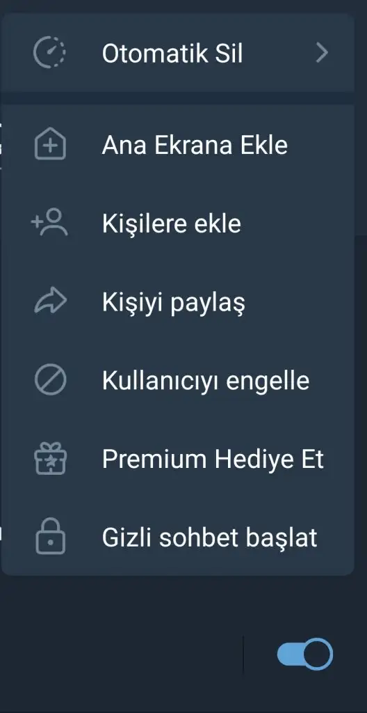 Hayır var süreli bile varHayır hayır bak yanlış biliyorsun telegramda otomatik silme yoktur sadece devre dışı vardır sen yazarsın normal bir şekilde silrsin ya da saatli olarak ayarlarsın örnek bir saat diyelim o bir saat dolunca Mesajlar kaybolur oda var mesela