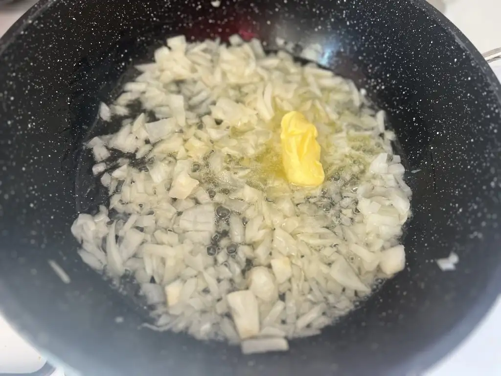 Soğanı ince doğrayıp sıvı yağ ve tereyağı ilave edip karıştıralım.