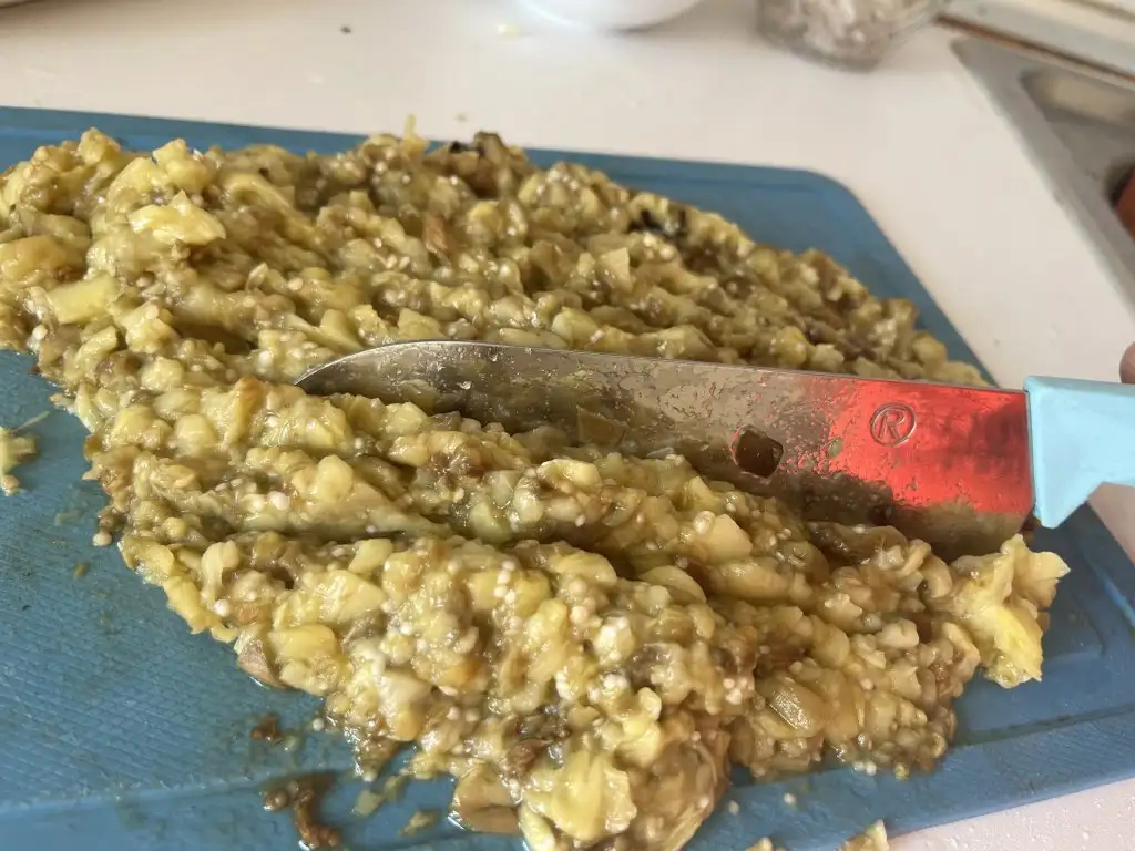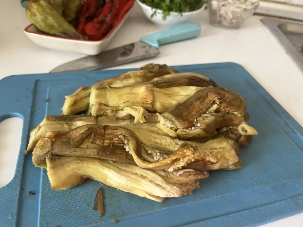 Közlenen patlıcanların kabuğunu soyup ince ince doğrayalım.