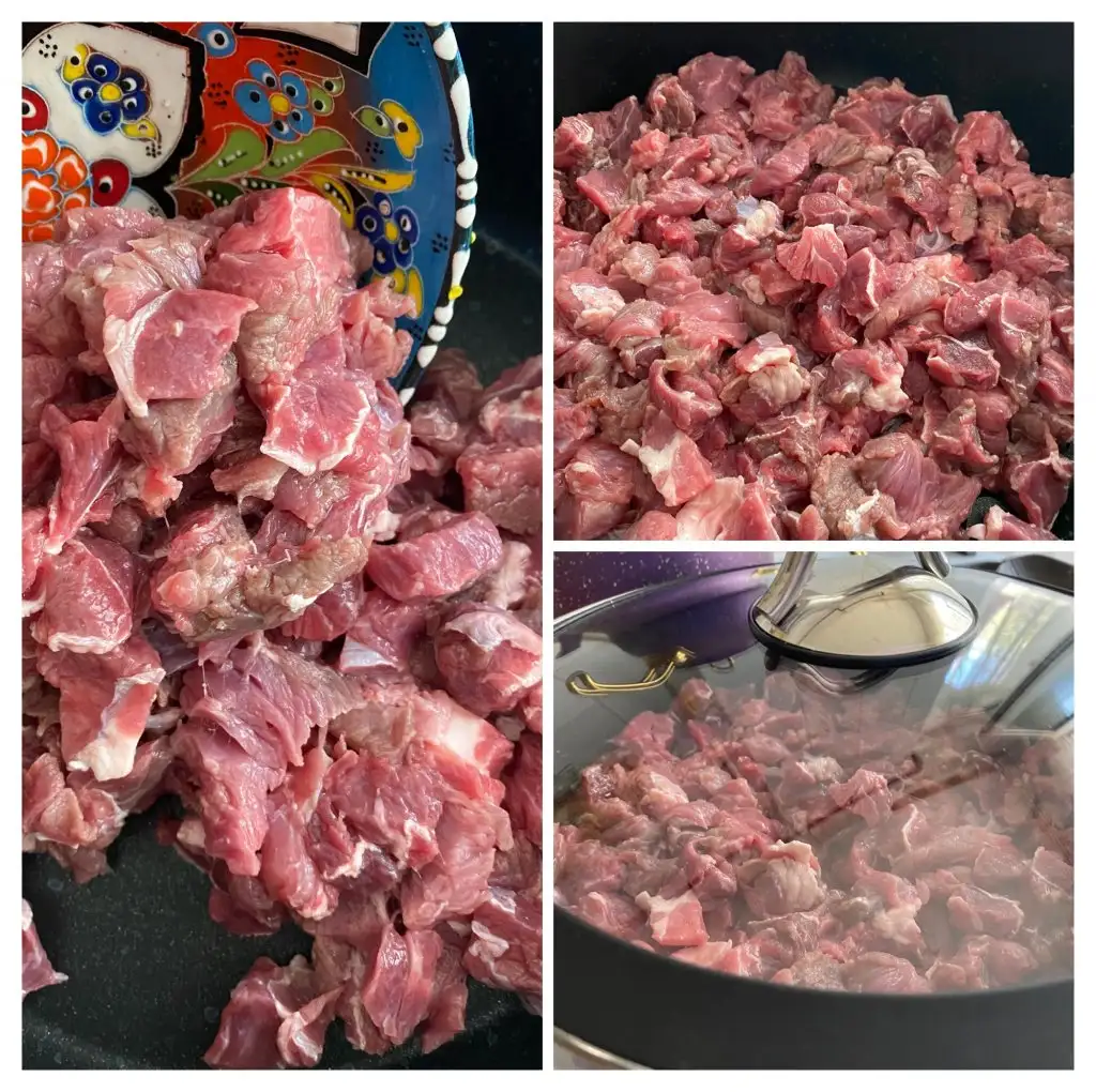 İlk olarak kuşbaşı doğrayıp yıkdadığımız etleri tenceremize alıp suyunu salıp çekene kadar kısık ateşte pişiriyoruz .Pişmeye yakın etimize tereyağını ardından sırası ile sarımsak salça ,baharat ve tuzunu ekleyip piştikten sonra altını kapatıyoruz .