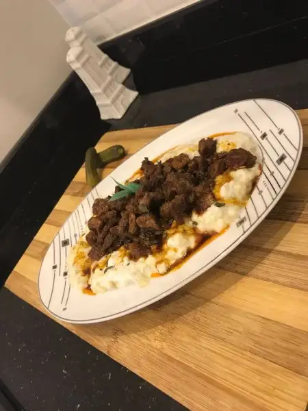 Tabağın altına yoğurtlu patlıcan karışımını koyuyoruz ortaya da etimizi üzerinede tereyağı ve toz biber karışımından döküyoruz.