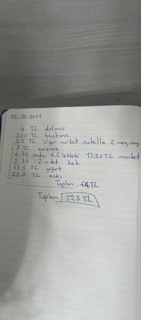 2 Kasım 2021'de toplam 323 TL harcamışımKızlar tarih tekerrür etmiş defteri biraz kurcaladım 2021 Kasım ayında da yazmışım ben
