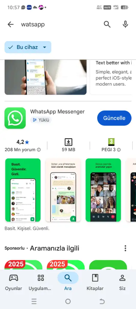 Öyle yaptım da aç diyo güncelle yazmıyoPlay store a gir watsapp yaz güncelleme çıkar