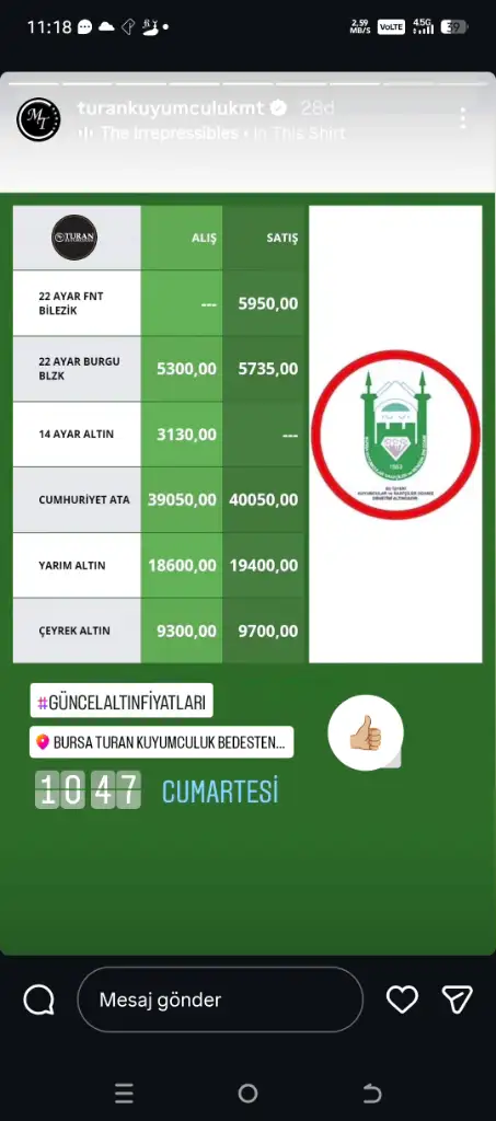 Dün baya artmıştı bugün düşmüş canım. Biraz daha düşse de alım fırsatı olsaKız artmamış aynı fiyat sabit yüz TL inip yüz TL çıkıyor kuyumcu paylaşmış