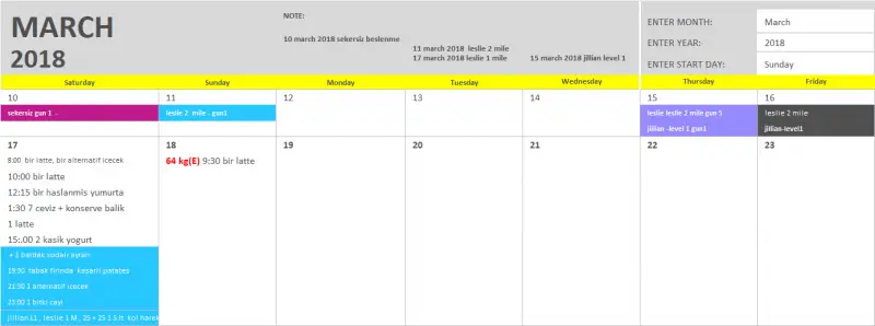 Ben telefonun uygulamasını kullanıyorum. Kalorileri de sayıyor suyu da adımları daKizlar ben boyle bir plan uyguluyorum. Artik kilomu da bastan yaziyorum. Kirmizi ile.E- Elbiseli demek oluyor.Daha once de yazdim. Laptopdan giriyorsaniz daha kolay. Excel calendar templateleri var. Onlari yukluyorsunuz. Isteyene template excel dosyasini gonderebilirim.