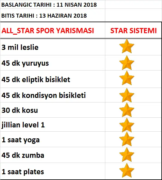 45 dk leslie = bir saat yuruyus = bir jillian = 1 saat yoga = 30 dk zumba = 30 dk kosu