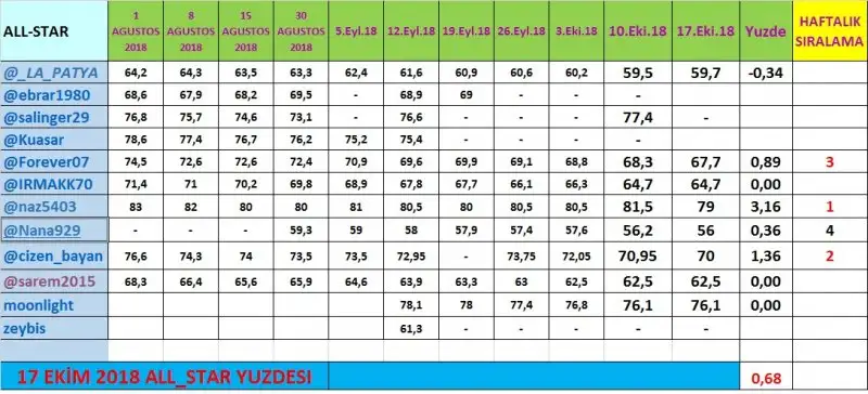 Tebrik ederim hepinizi arkadaşlar17 ekim 2018 ALL STAR ilk sıralama sonuçları