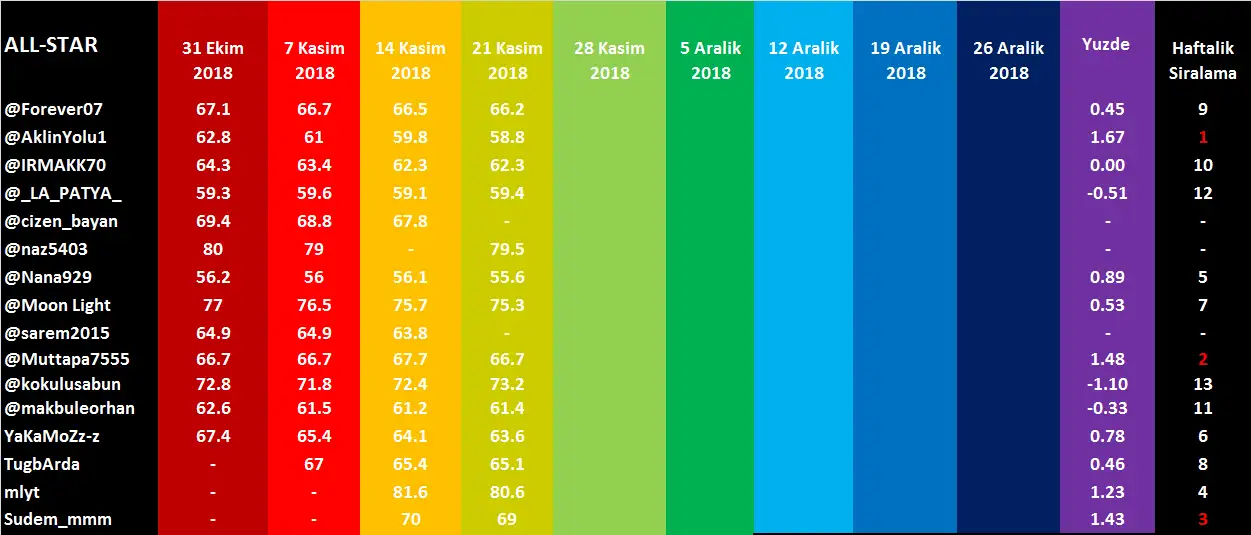 Son gelen arkadaşlar ile daha umutluydum ben açıkçasıKilo yuzdelerine gore siralama; kilo veren ve vermeye calisan arkadaslar tebrik ediyorum.