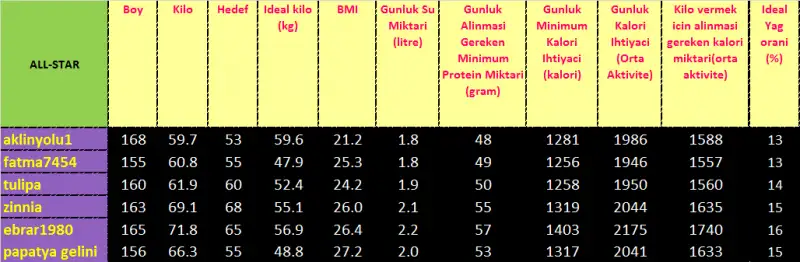 Sizlerde durumlar nasıl grup ahalisiii nerdesiniz heyy, başkanımız ile fatma bamlanmış onu gördüm. Yani şurada kilo vermeye çalışıyoruz ben birinci olayım hep ben ben olmaz ki bana göre saçma sapan muhabbetten olan bizim canolara olmuş.Ne geçiyor elinize istersen yalan söyle sen 5 kilo verdim de beni ne ilgilendirir. Yapıcı olmak yerine ortalığı ayağa kaldırmışlar resmen.