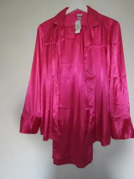 hiç giyilmedi etiketi üstünde, saten pembe pijama takımı, bedeni small. Fiyat: 70TL
