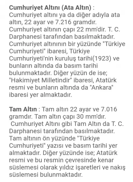 Bu ay eşim bi altın aldı. Adı ne oluyor bunun bilmiyorum. Ata mı tam mı deniyor. İki ay önce de kumbaramı açtım 975₺ biriktirmişim onla da o tam veya ata olandan aldım. İki oldu. Eşim de Doğum günümde kalın bi zincir almış. Şimdilik birikimim bu. Ama burada sayenizde azme gelip ayda bi küçük altın almak istiyorum. Kalan para da kumbaraya girer(tabi arttırabilirsem)
