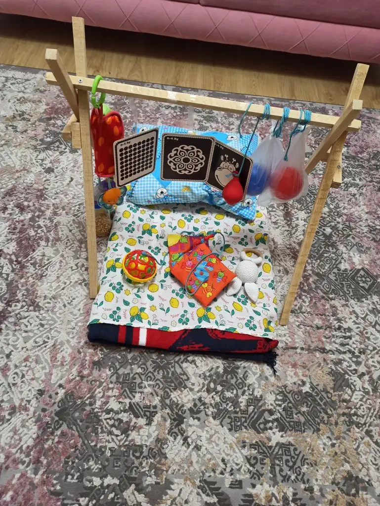 Bu hem karın üstü egzersizi hemde sırt üstü yatarken kullandigimiz bisey çok güzel internette de satılıyor biraz dağınık şu an ama aktivite yapmak içinde çok hoş buzdolabi poşeti içi su dolu balon zeka kartlari hem dokunacagi hemde izleyebilecegi şeyler asilinca çok güzel duyu geliştiricegini düşünüyorum inşallah 😍