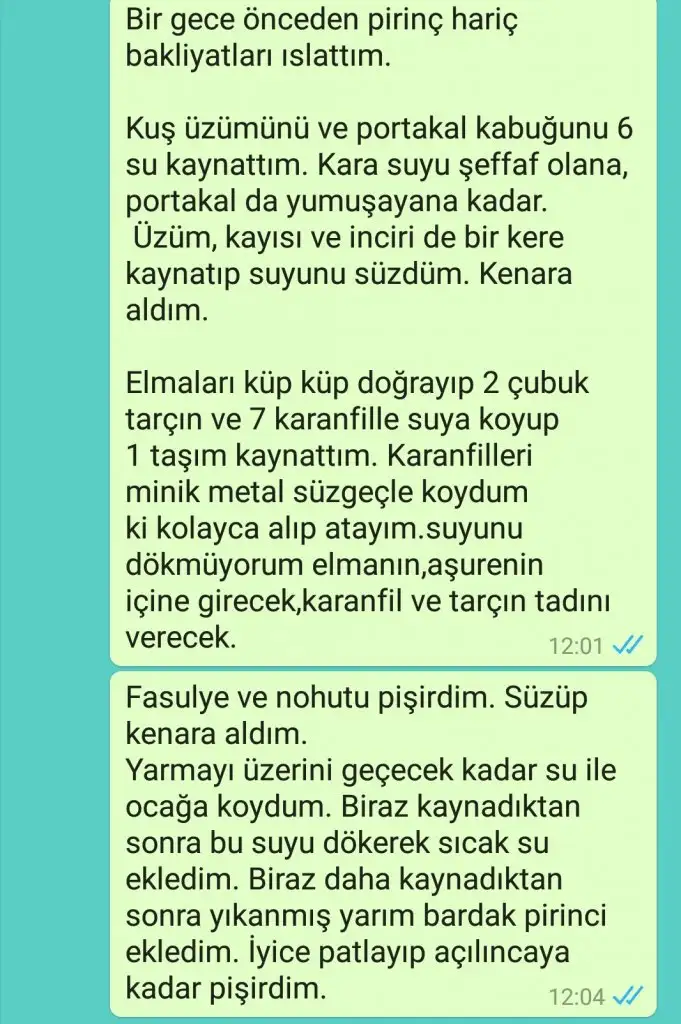 Müsait olunca bana aşurenin tarifini yazarmisinGünlerdir ocakta bir şey kaynatmıyordum bir garip geldibugün 11de kızın okulunda kalan eşyaları almaya gideceğim, dünden erik doğramıştım onları kaynatıp öyle giderim.