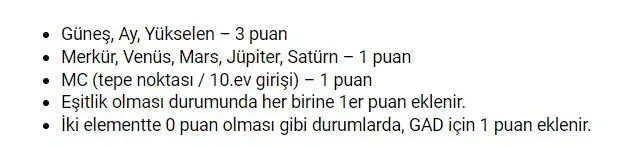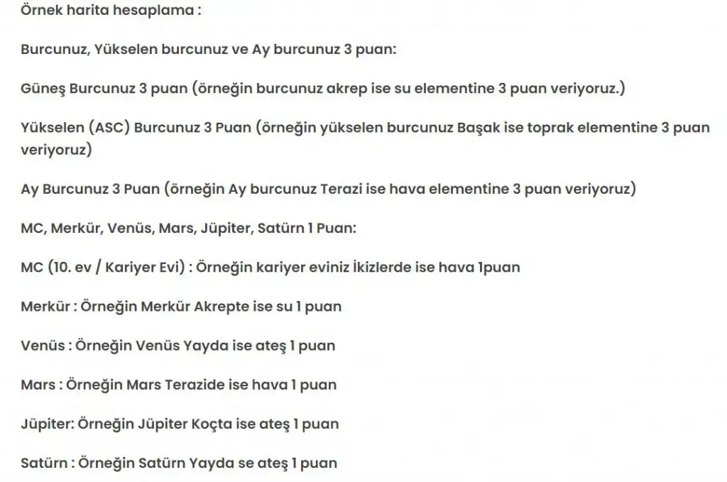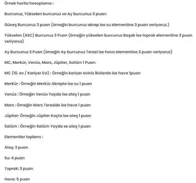 Haritamızdaki gezegen konumlarına denk gelen burçların dahil olduğu elementleri buna göre hesaplıyoruz. Toplamın 15 olması gerekiyor buna da dikkat etmek gerekiyor sanırım. En düşük puanlı element eksik elementimiz oluyor.