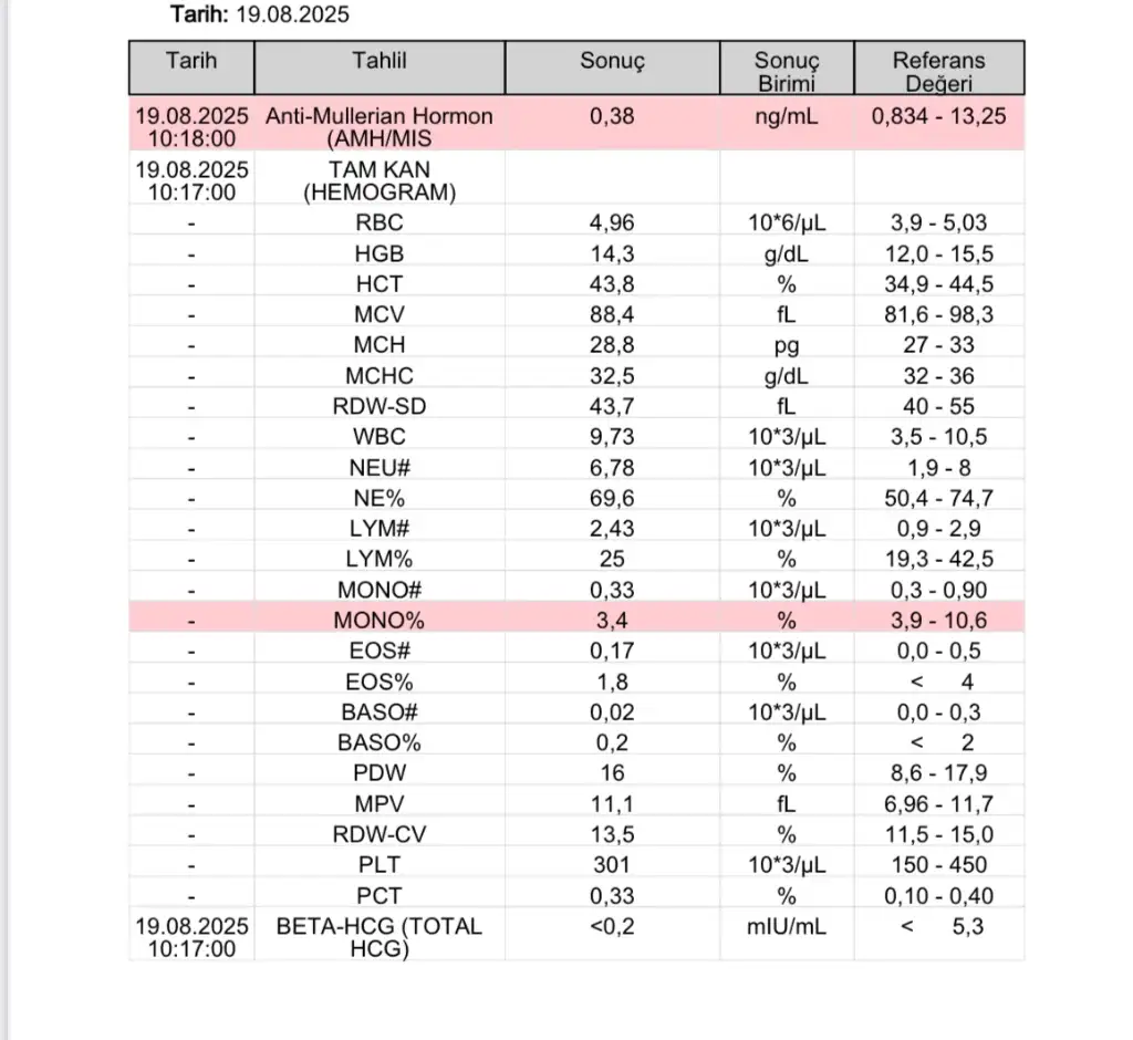 Evet canım yaşına göre düşük normalde 50 il yaşlarda böyle oluyor ama doktorlar ilaçlarla yükseltebiliyor yada yumrurta donduruyorlarKızlar merhaba 3 yıldır evliyiz ve son 2-3 aydır korunmayı bıraktık (eşim korunuyordu) bugün bi doktora gözükelim almamız gereken takviyeler var mıdır diye kadın doğuma gittik ve Amh değerim 0,38 çıktı eki de ekliyorum bu değer ile hamile kalmam mümkün değil mi ? Yaşım 29 düzenli 28 günde bir regl olurum temmuz ayında da ovü takip etmiştim ve 16 günde çatlama görmüştüm veya bu değeri yükseltmek mümkün mü lütfen bakar mısınız