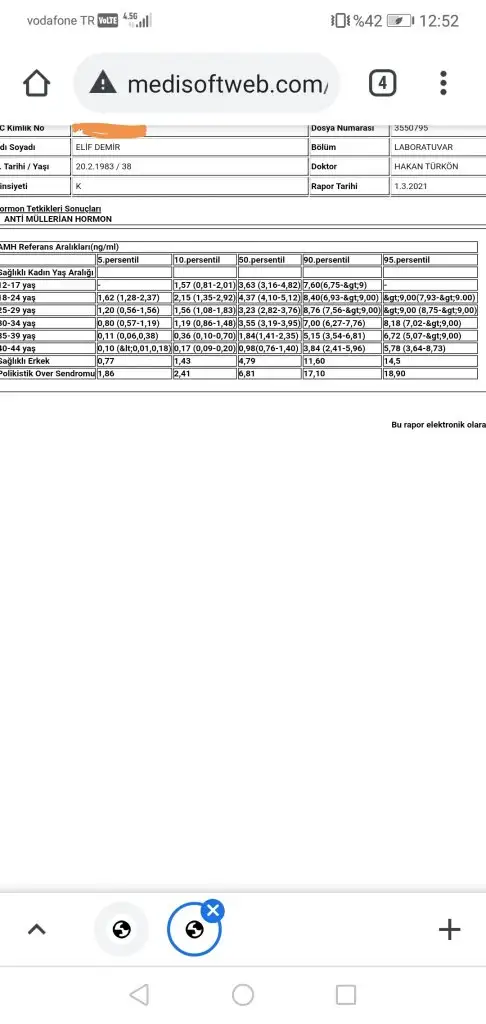 Benim de bundan 7 yıl önce tam da bu değerde çıkmıştı. Fsh değeri de önemli tabi. O zamamlar çocuk için baktırıyordum. Şimdide adet gecikmesi yaşadığım için menopozmu acaba diye baktı doktor. Sonucu merakla bekliyorumCanım sağ altta cümle yarım kalmış, “bu rapor elektronik olarak ...” yazıyor, “imzalanmıştır” kısmı görünmüyor, belki hastanenin sayfasındaki sayfa boyutu büyüktür dokunmatikle kaydırarak veya küçülterek tamamı alınabilir,sonuç kısmı görünmüyor gibi, bende amh baktırdım benim 0,84 çıktı ve doktor bana bu değer için düşük dedi referans aralıklarını persentil olarak göstermişler, bende kendime baktım sizin testten
