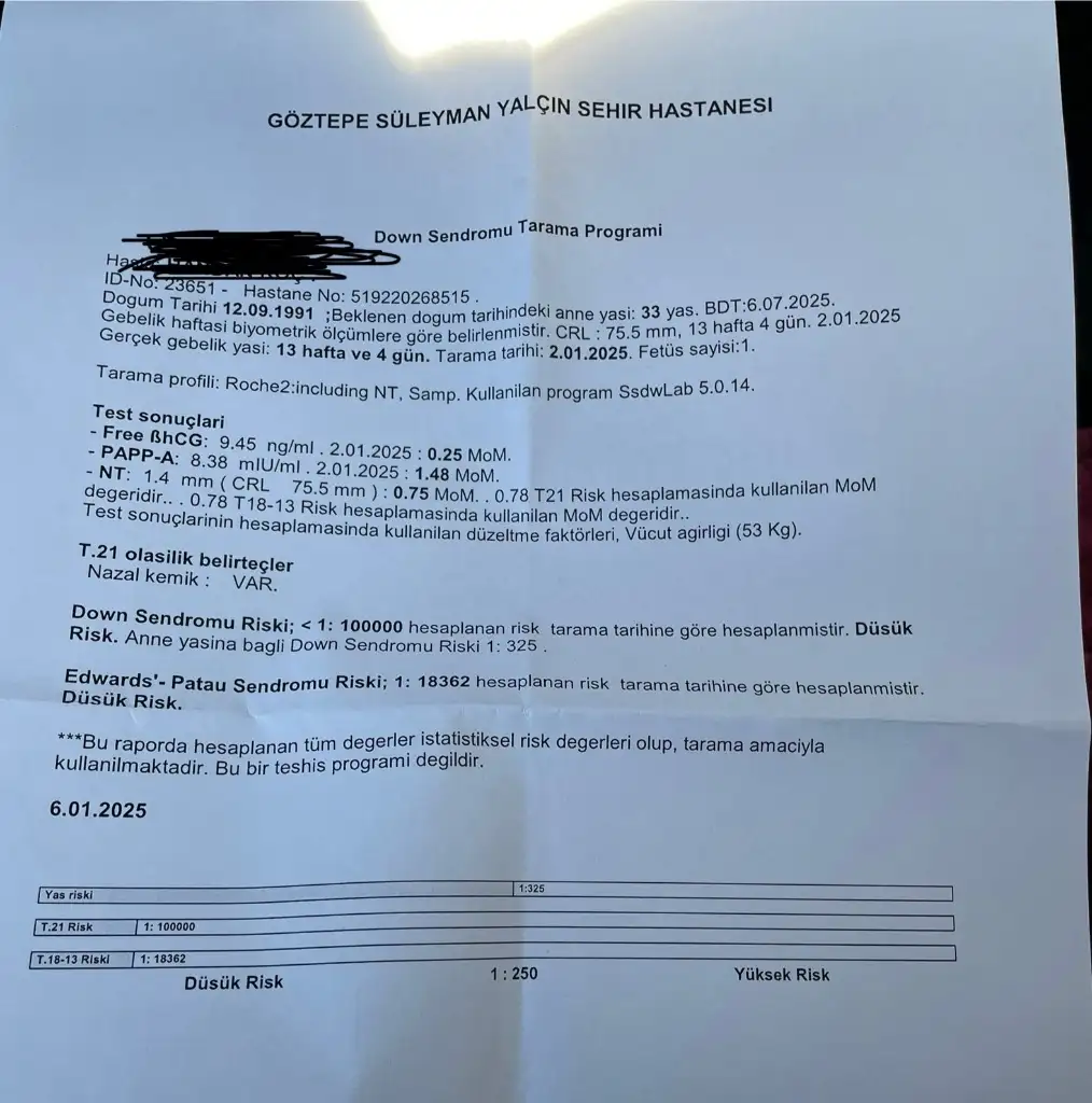 Ben yaklaşık 2 hafta önce ikili tarama testi yatırdım ve yaptırdığım testi sonucuna göre anne yaşına bağlı risk 1:325 çıktı. Bunun sonucunda amniyosentez testi önerildi. Bu testi yaptırmam sağlıklı mı? Ya da yaptıran arkadaşlar varsa bana yardımcı olabilir mi? Fetal DNA testi için maddi durumum yok. Kafamda ki şüpheler otursun istiyorum. Şuan 15 haftalık hamileyim dualarınıza ihtiyacım var🤲🏻😔