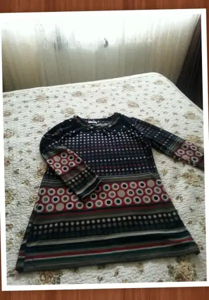 44 beden ama kalıbı bol. 48 beden3 kadar olur. Ben elbise olarak giyiyordum. Diz üstü tunik olarak giyilebilir.