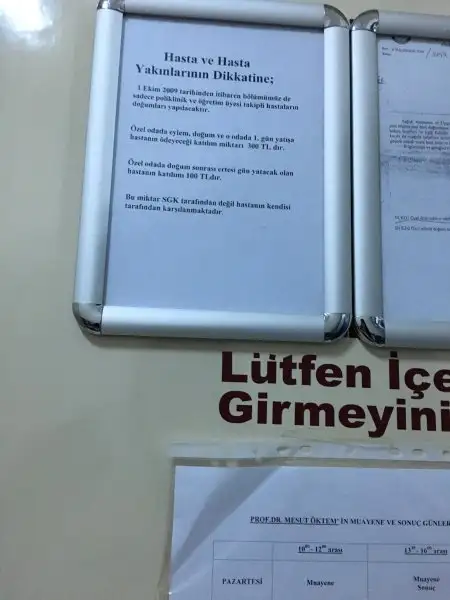 Mesut hocanın hasta gördüğü yerin kapısında bu yazılar vardı. Muayene ücreti de öğretim görevlisi için 122, poliklinik için 30, ücret ödenen yerde yazıyordu. Doktorum doğumhanede zaten belirli sayıda insan olur, ama internler de olur, onlara ben engel olamam öyle bir yetkim yok dedi. (Ben sancışanırken vs bir sürü kişi girip beni muayene edecek mi vs ben az kişi istiyorum demiştim, o yüzden böyle dedi.) O an kendi odanda doğumu sormadım, aklıma gelmedi ama ekteki gibi bir yazı olması aynı şeyi düşündürdü bana, özel odada doğumu yani.