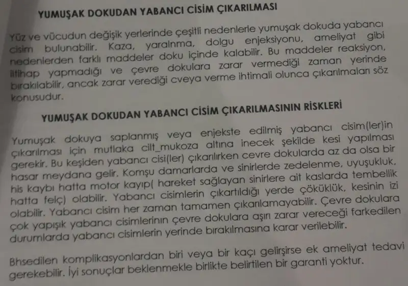 Yani çökme gibi kötü bir iz vs olursa bunu kabul etmismi oluyorum. Ama ben hyalunoik asit dolgusu istedim. Erimeme ihtimali yokmuş bu dolgunun. Dr. Nebil Bozdoğan a sordum 3-4 tane dolgu saydı radiesse suculptra kalsiyum apatit aquafiling. bunlar olabilir dedi. Firmaları aradım ama hiç böyle bir olay duymamislar. Nette de bulamadım. Dolgu ilk sıkılırken de taş gibiydi taş gibi oturdu kaldı 4 senedir. Derimin altında kayıyor. Dokunan arkadaşlarım hayret ediyor. Arkadaşlar çözümsuz kaldım . Caresizlikten buraya yazıyorum. İki gün üst üste serum fizyolojik le eritmeyi denedik ama ya dolguya denk gelmiyor kaydigi için yada çok sert etkilenmiyor. Bilemiyorum. Serum yapılırken yanaklarımın içi parcalaniyor Dayanamıyorum. Ne olur bir bilen bir çare söylesin yada yer tavsiye etsin. İki gün serum sıkılırken yüzüme hayatımın en büyük acılarını çektim. Gözlerimde yaş kalmadı. Göz beyazim kan kırmızı olana kadar hickira hickira ağlıyorum acidan. Yüzüm iğne izleri doldu suratimin içi serum dolu. Daha kac sefer yapariz bilmiyorum diyor. Yokmu bu dolguyu almamizin yolu. Dolgunun ne olduğunu bilmiyoruz. Fakat alma yöntemi yokmudur yapan bir yer vs . Allah rızası için neolur biri bana yardım etsin.Hiçbir hak talep edemezsin eminsen erimesi için imzala sonrasında ki görüntüden sen mesul olucaksin.