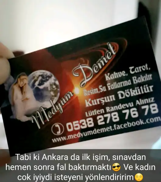Falcı değil tıp doktoruymuş mübarek.Ben normalde istanbulda oturuyorum. 2 gunlügune ankaraya geldim. Biraz geziyim dedim ve sonra cani fal baktirmak istedi. Sokaklari dolaşa dolaşa falci aradim. Ilk gozume carpan yere giricem dedim. Ve bi tane gordum ama yanina gidince orda 3-4 tane daha falci oldugunu gordum. Hislerime guvenerek ilk gordgume degil yanindakine girdim. Kafenin adini bilmiyorum ama gırgirla ayni binada. Falcinin ismi medyum demet. Forumu okudum kimse bahsetmemis galiba. Ama bence cok cok cok iyiydi. Detayli kahve fali 25 tl. Yidizname de katiyo icine biraz.