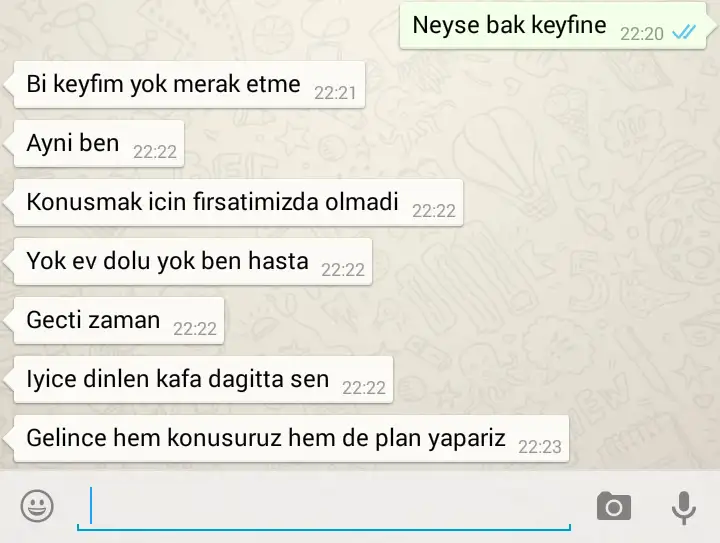 pek bir şey yapmıyorum, geldiğimden beri eşimle konuşmadım denebilir. Dün gece bir ara yazıştık o da şu şekilde oldu...