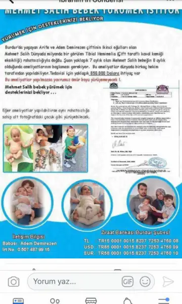 Bu bebeğe yardım etmek ister misiniz ameliyat olmazsa kesilecek bacakları satsanız o eşyaları bu bebeğe yollasanız parasını ne büyük sevap olur babanıza gecenin bu yarısında beni uyandırıp bu mesajı attıran Rabbimin bir hikmeti vardır inşallah.