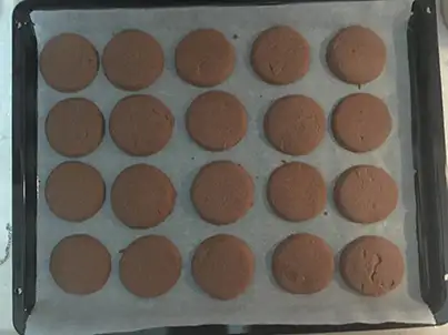 Hamur bitene kadar aynı işlemi uyguladıktan sonra pişirme kağıdı serili bir fırın tepsisine tüm kurabiyeleri yerleştiryoruz. 180 derecede ısıtılmış fırında 10 dakika kadar pişiriyoruz. Buraya dikkat 11 dakika olmasın sertleşmeye başlıyor fazla kalırsa.