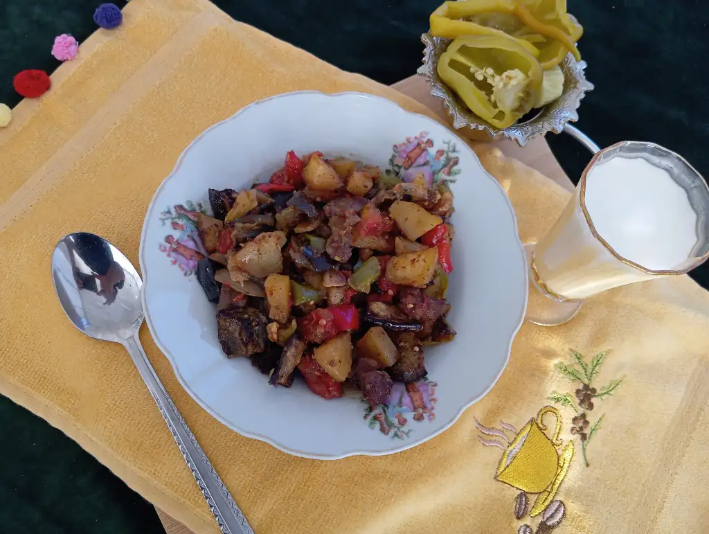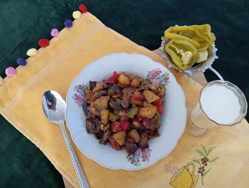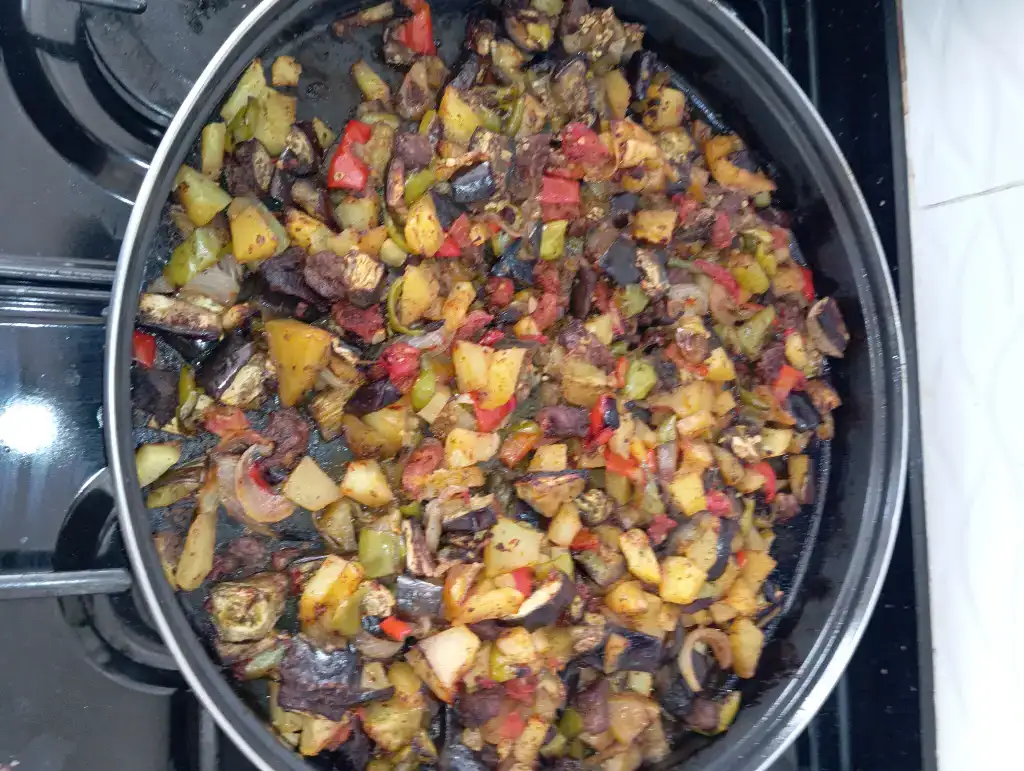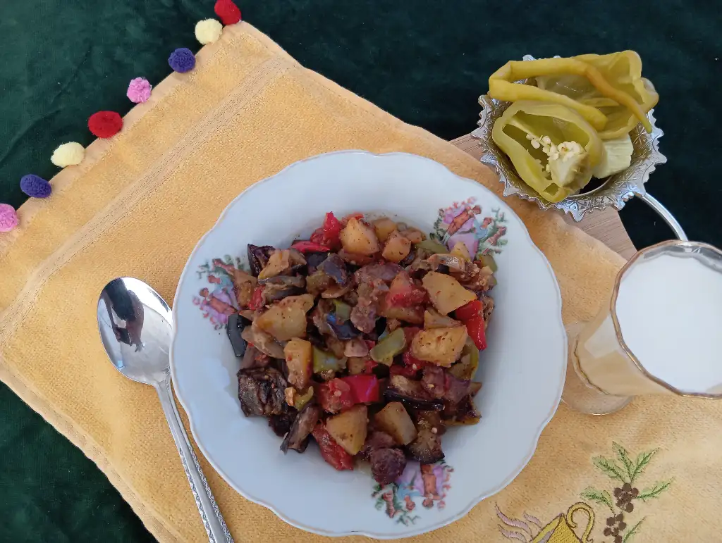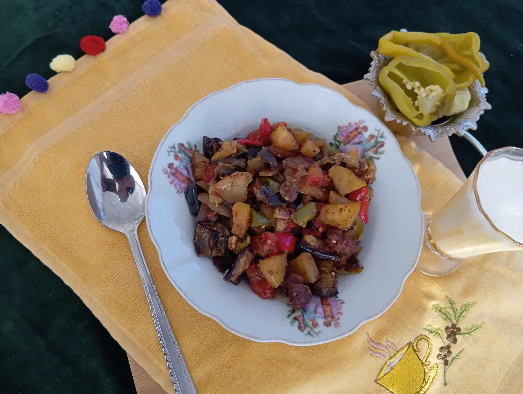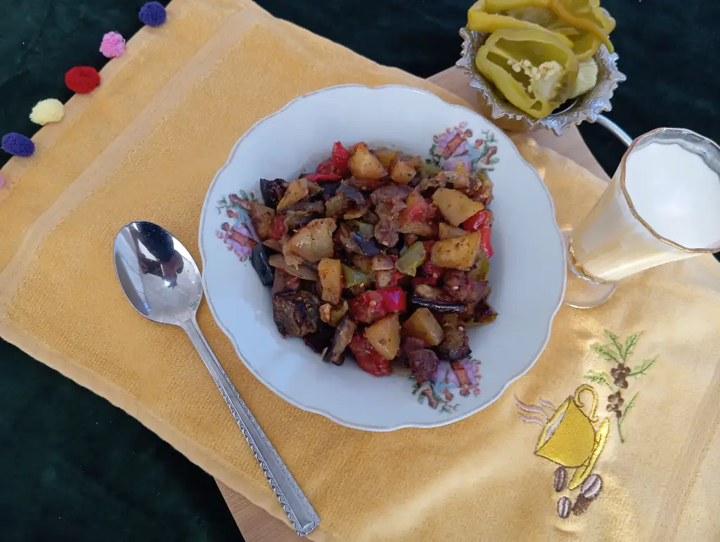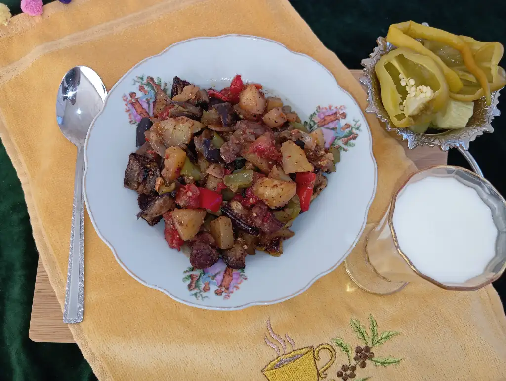 Malzemeler ; 1 kuru soğan 1 sarımsak 1 kırmızı sivri biber 2 adet patlıcan 5/6 adet patates