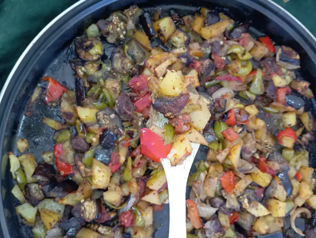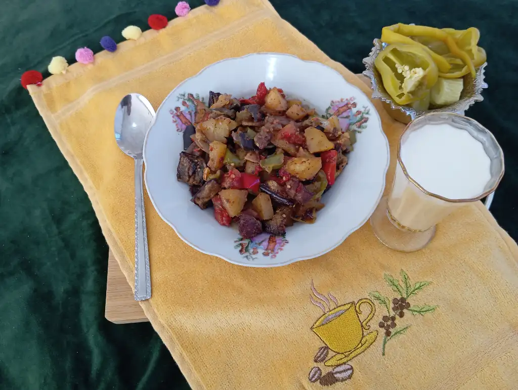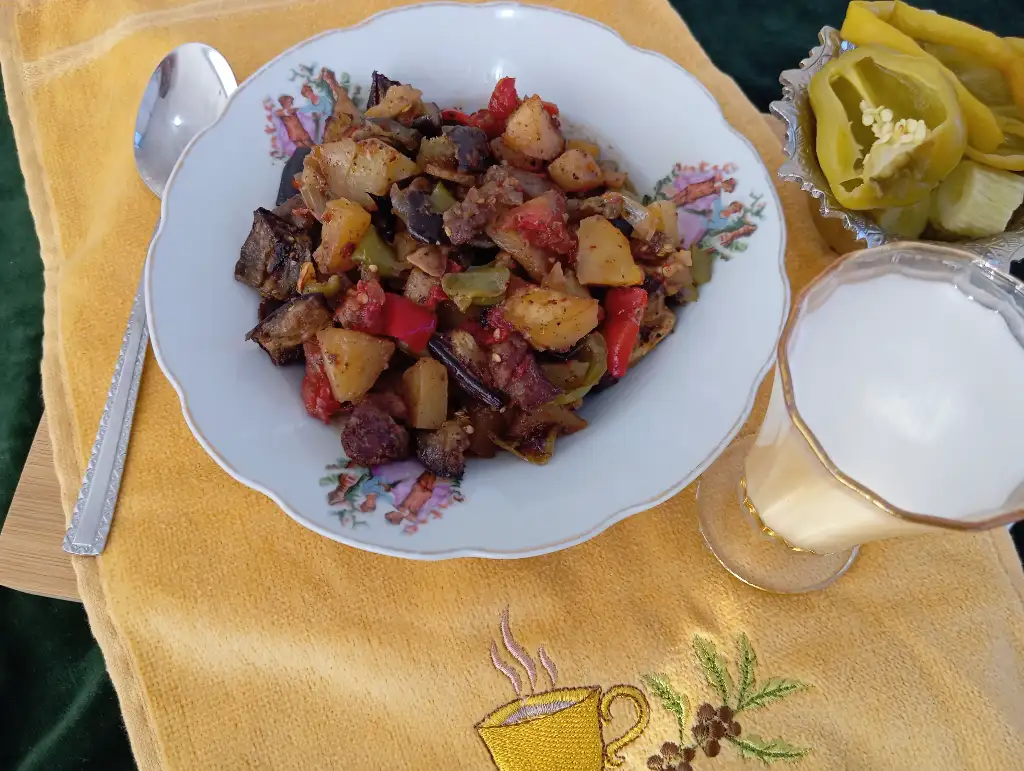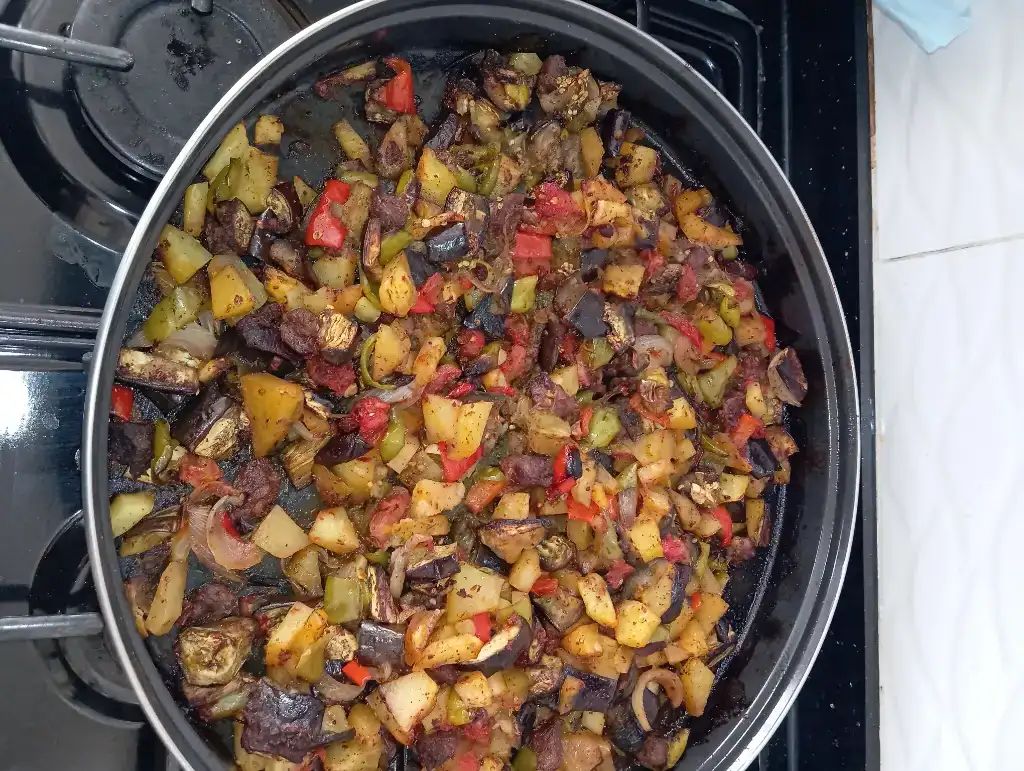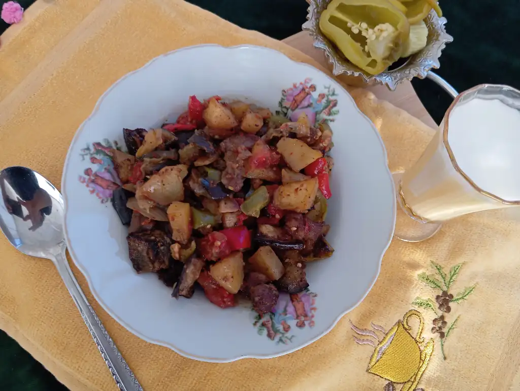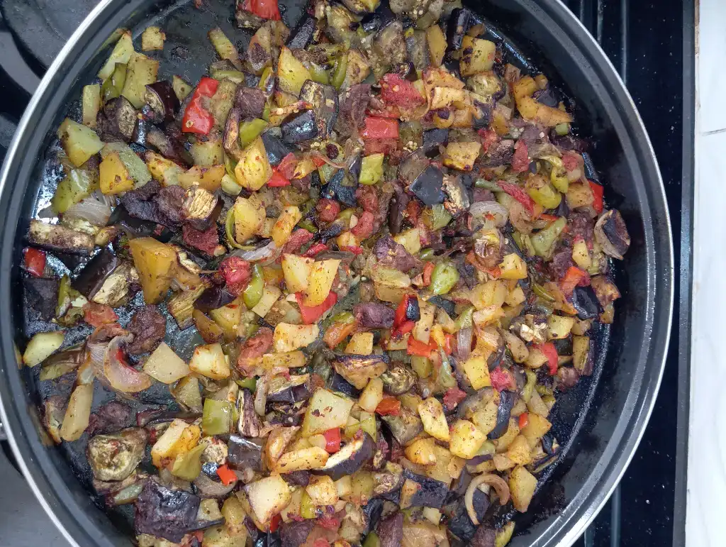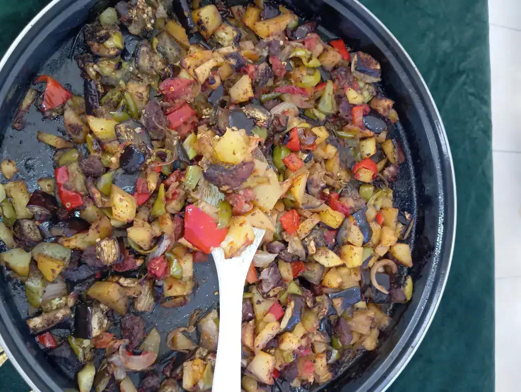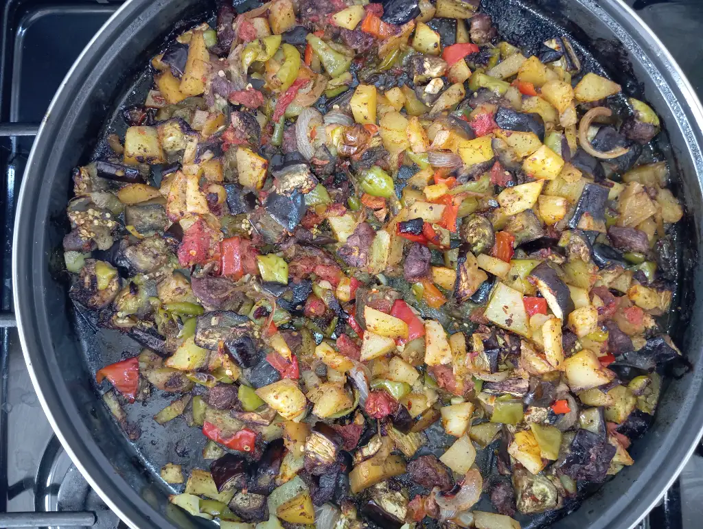 Malzemeler ; 1 kuru soğan 1 sarımsak 1 kırmızı sivri biber 2 adet patlıcan 5/6 adet patates