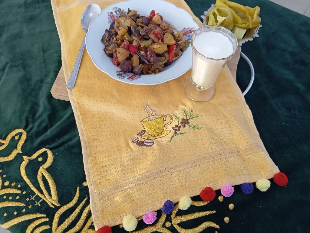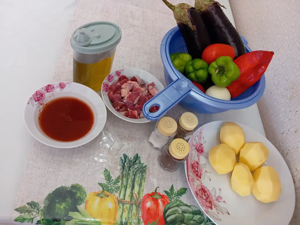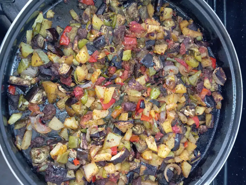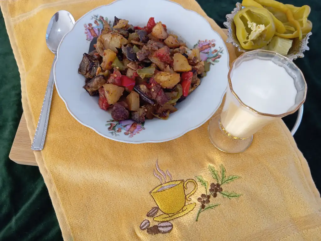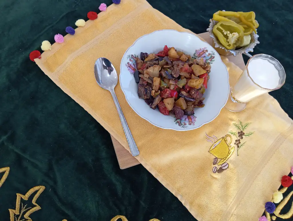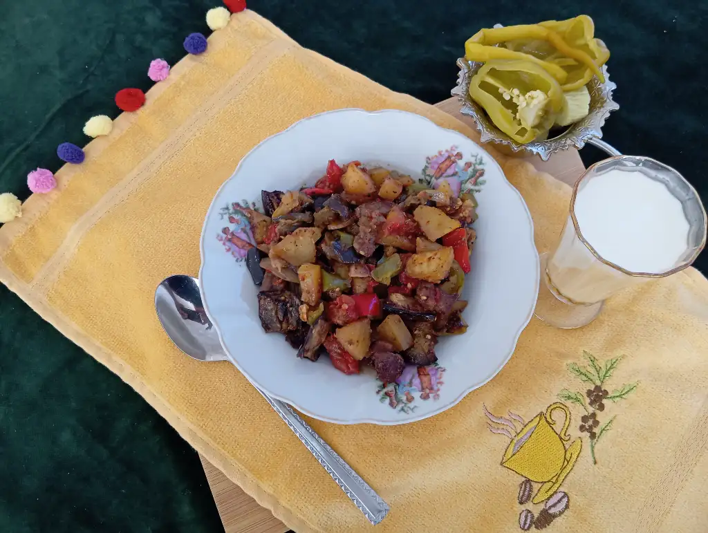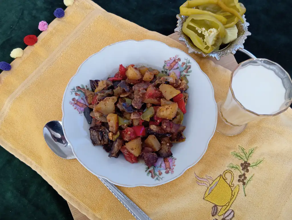 Malzemeler ; 1 kuru soğan 1 sarımsak 1 kırmızı sivri biber 2 adet patlıcan 5/6 adet patates
