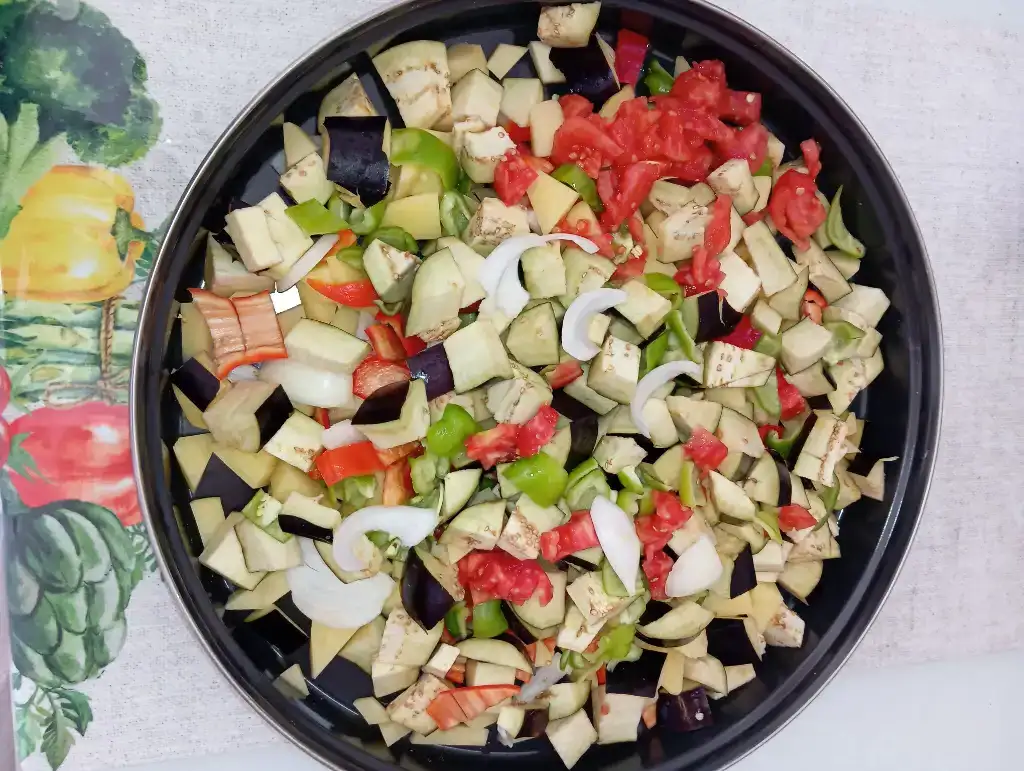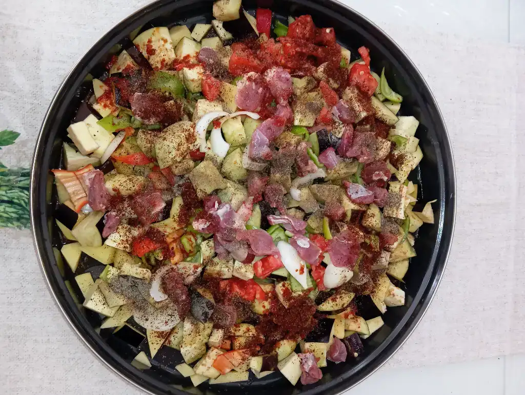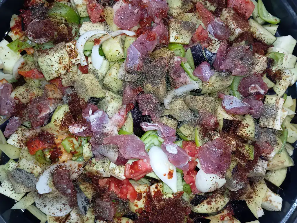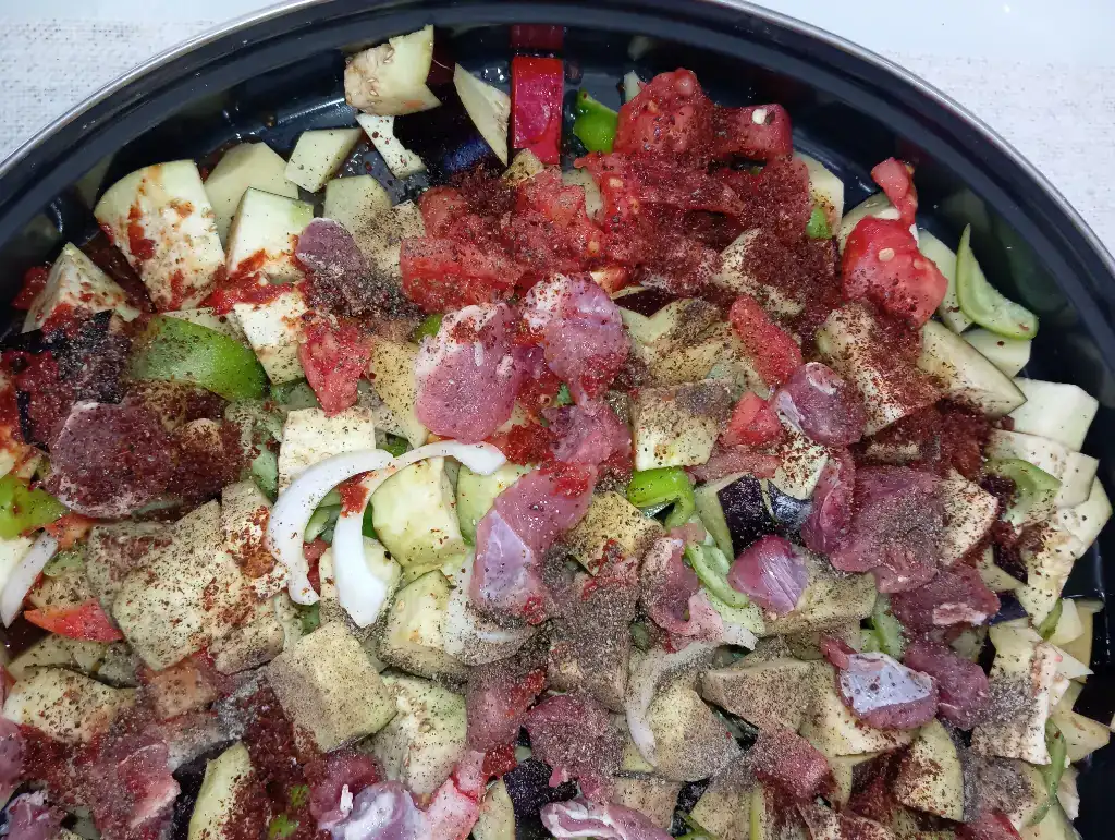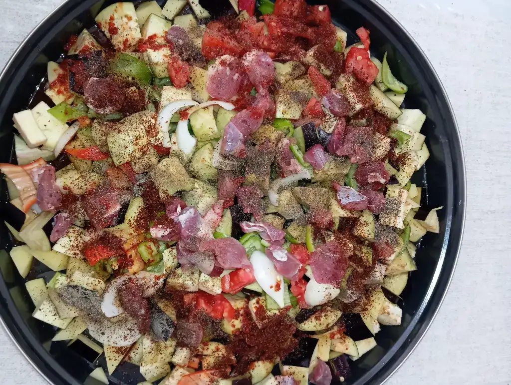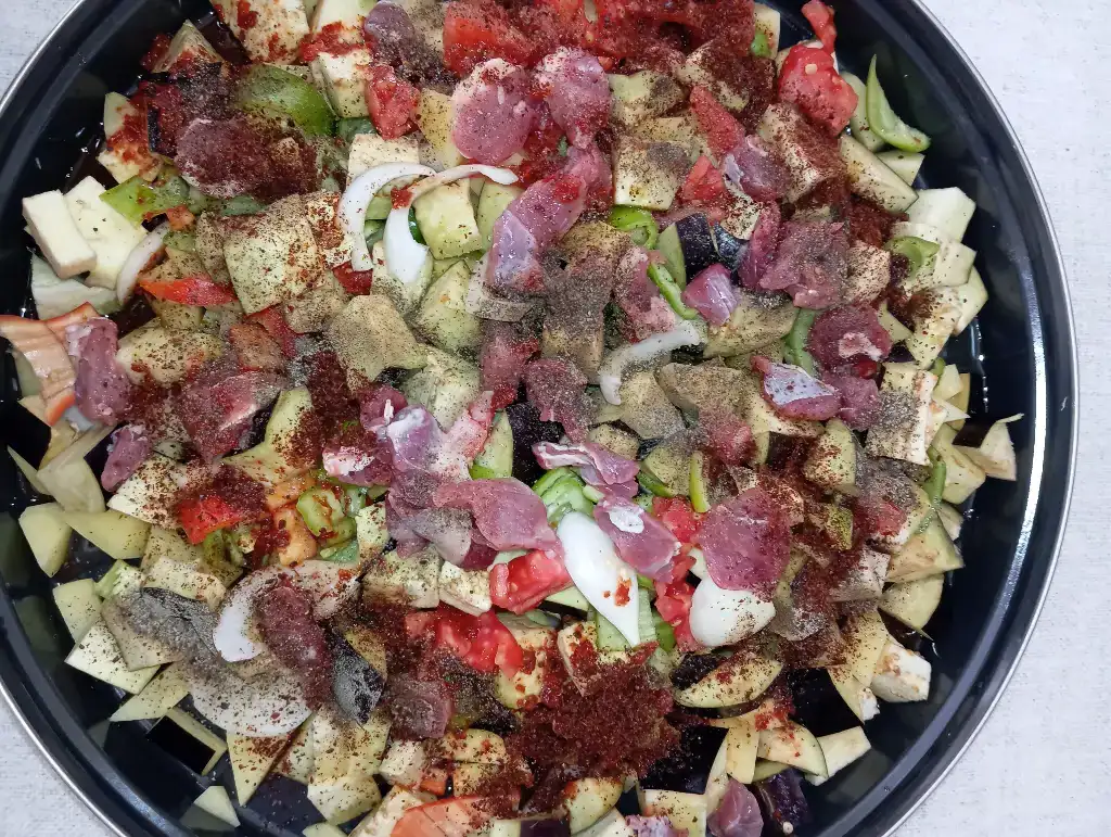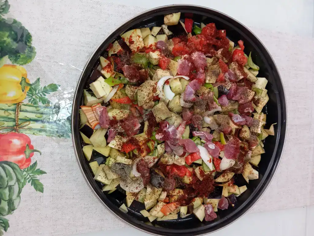 Yapılışı ; malzemeleri sırasıyla doğramaya başlayalım . Hepsini doğradıktan sonra salça ekleyip zeytinyağ ilave edip baharatlarını koyup karıştıralım. 200 derece ısıtılmış fırına koyalım...
